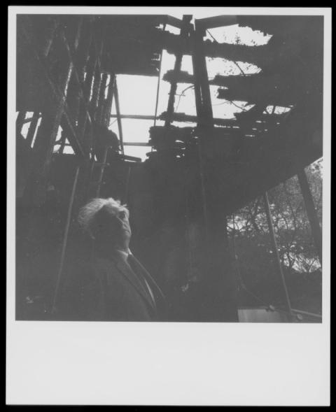 In the spring of 1963 when the Neutras were in the Midwest, a fire destroyed the VDL Research House. The unexplained fire, possibly of electrical origins, started in the office on the ground floor. About midnight of March 21, Dion received a startling phone call with the news of the fire. He rushed to the scene and was able to direct the fire department in saving many valuable documents. Dion, noting the quantities of water penetrating to the basement archive, organized the movement of hundreds of drawing rolls out into the street. When all was over, the smoking ruins told a disheartening tale: the virtual destruction of a lifetime of memorabilia, books, files, drawings, work in progress, original manuscripts, and countless other materials which were virtually irreplaceable.